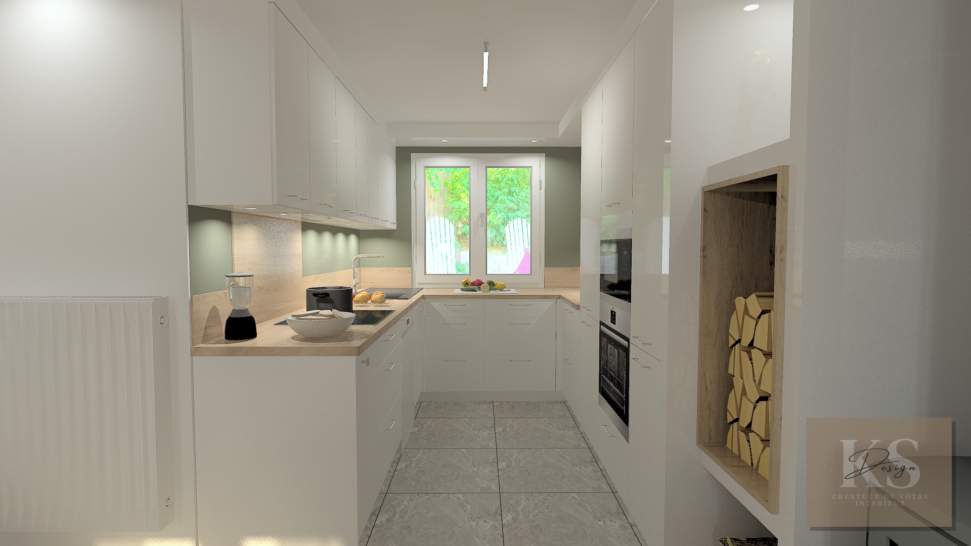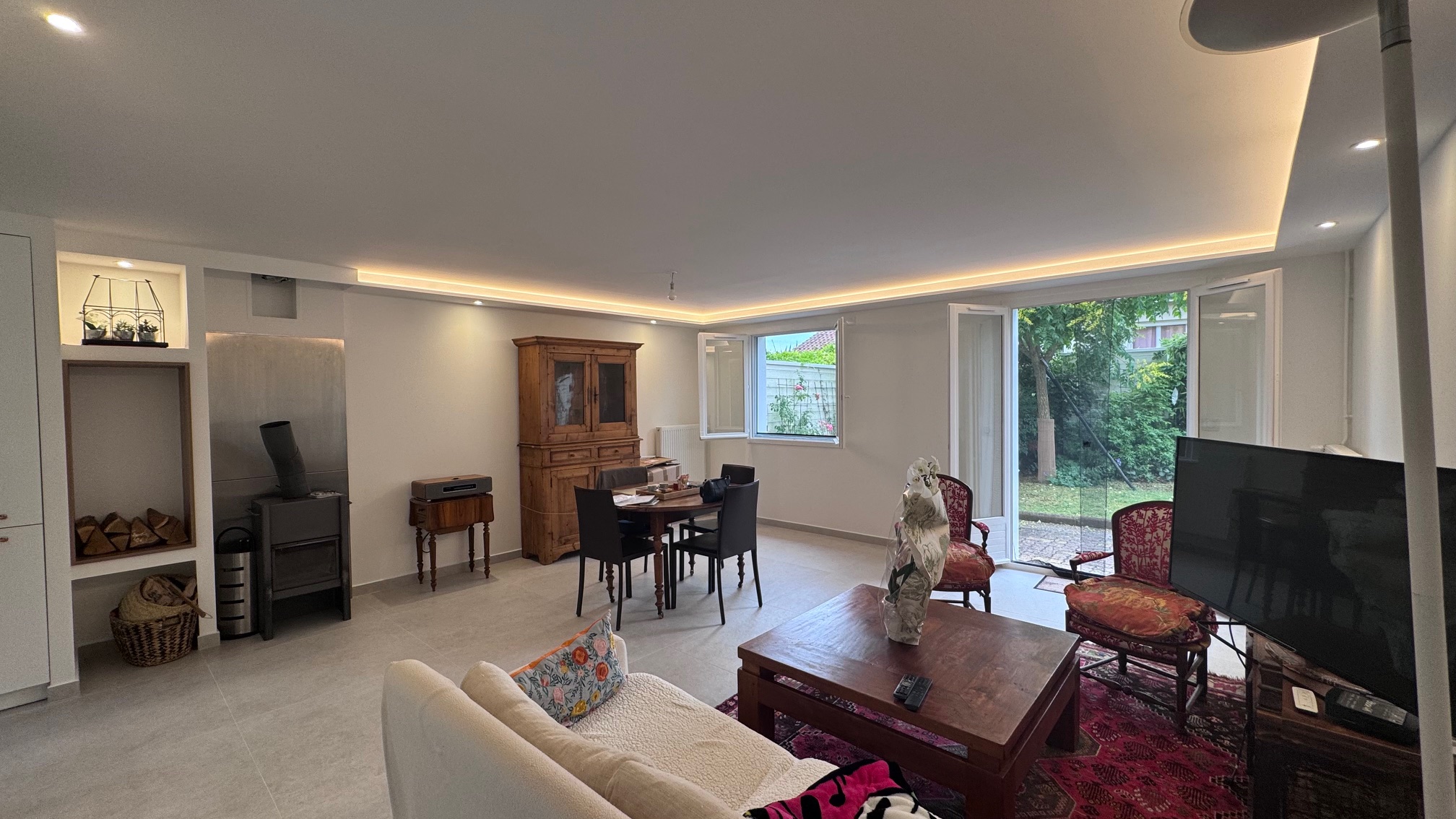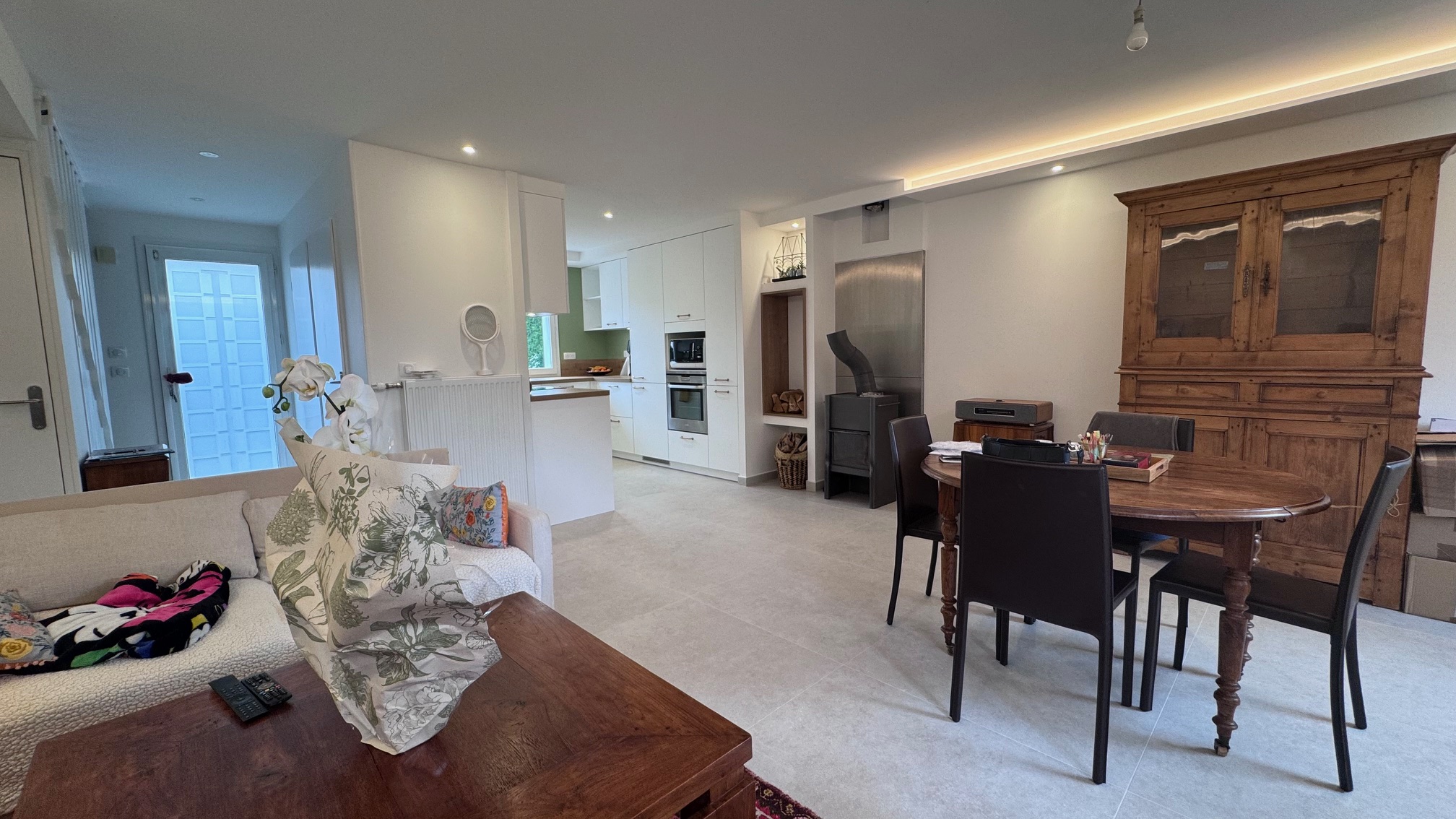 Nous avons également conçu un habillage en placo pour le poêle, intégrant harmonieusement la liaison avec la cuisine.