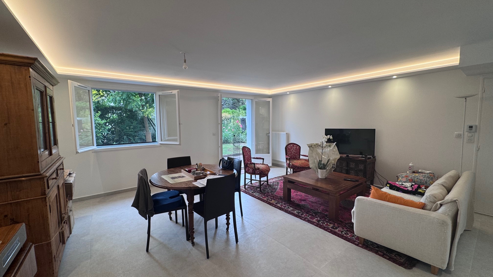 L’éclairage a été entièrement revu : création de bâtis en placo au plafond pour délimiter et unifier le salon et la salle à manger, intégration d’un éclairage indirect par bandeaux LED dans les corniches, ajout de spots pour mettre en valeur les tableaux, ainsi que de nouveaux éclairages sous les meubles hauts de cuisine.